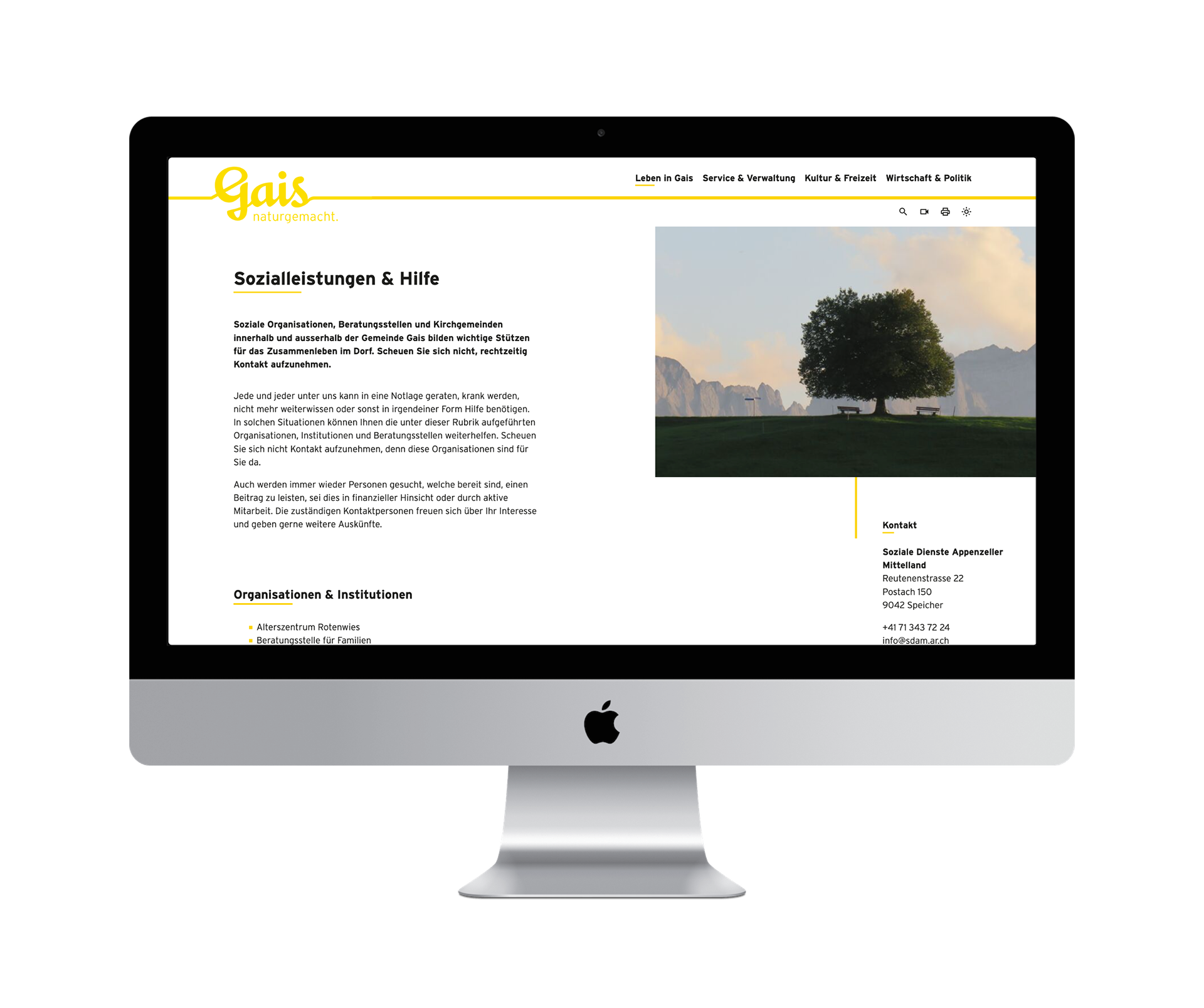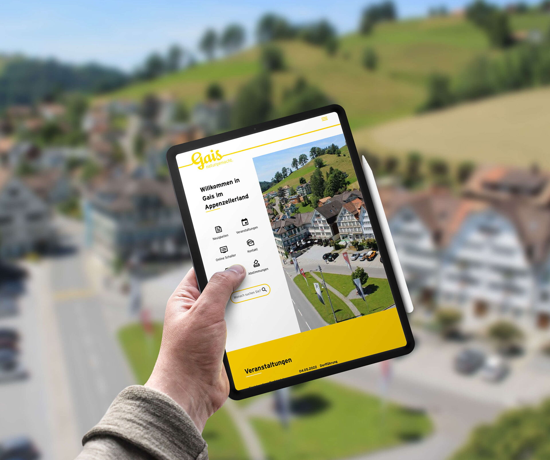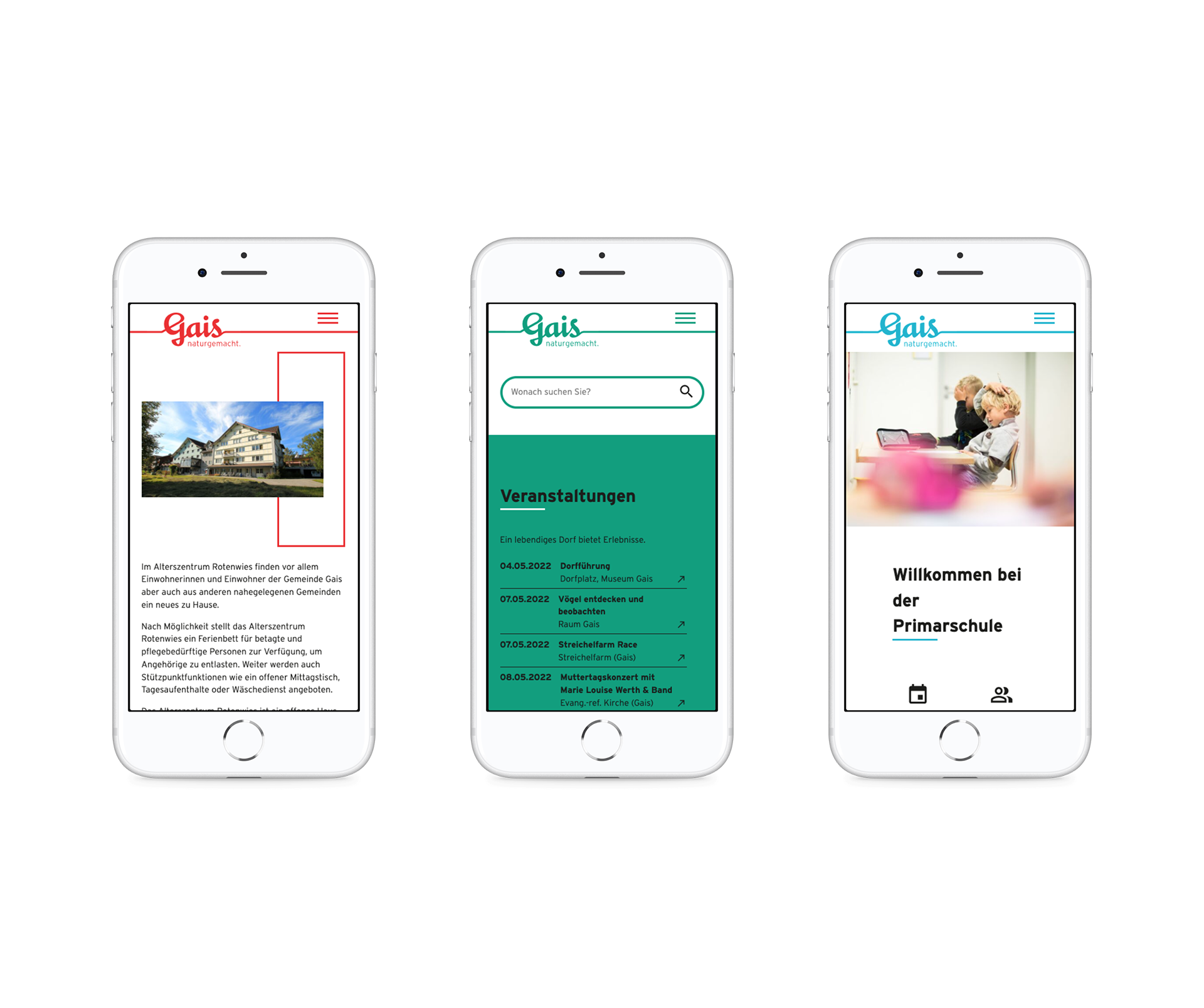 Ergänzend zur Website durften wir einen interaktiven Infoscreen beim Gemeindehaus in Gais realisieren. Der Screen ist mit den 5 Websiten der Gemeinde (Gemeinde, Tourismus, Primar, Oberstufe und Alterszentrum Rotenwies) vernetzt und kann Informationen, wie News, Veranstaltungen, etc. von diesen Seiten abrufen und darstellen.